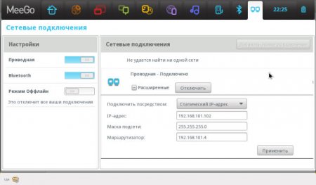Ладненько, по сравнению с моблином теперь хотя бы проводное соединение работает нормально. И даже настройки соединения можно вбить ручками. Замечательно. Однако переключаться табом между параметрами еще нельзя. Вероятно эта фича запланирована на MeeGo 2.0.