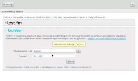 Ладно, регистрирую аккаунт в твиттере, забиваю логин и пароль… Ага… «Невозможно войти в Twitter». Проверяю логин и пароль, захожу в твиттер через браузер — все отлично. Ну что же, видимо не судьба.